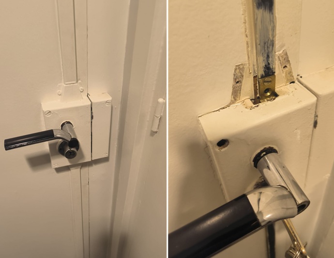 Diagnóstico y Desmontaje de Alta Precisión: Al abordar las dos puertas, confirmamos la obsolescencia de los cilindros anteriores. La operación requirió el desmontaje minucioso de las cajas centrales de las cerraduras, un proceso delicado dado que los mecanismos Fichet poseen una arquitectura interna compleja que no admite errores.